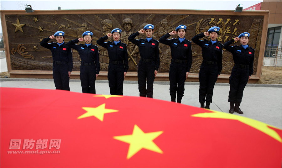 在维和警队浮雕前,女队员们举起右手,面向国旗和联合国徽庄严宣誓:“我志愿加入常备维和警队,服从中国共产党的领导,献身联合国维和事业,服从命令,严守纪律,苦练本领,捍卫和平,坚决做到不忘初心、不屈不挠、不怕牺牲、不辱使命,为祖国争光,为警徽添彩,为构建人类命运共同体贡献力量!”